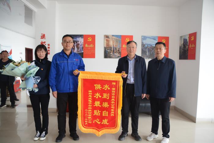 4月12日,濮陽惠成電子材料股份有限公司企業(yè)代表將一面寫著“水到渠自成,供水最貼心”的錦旗送到了市自來水公司管網科,感謝在供水報裝工作中對企業(yè)的全程服務與積極幫助。