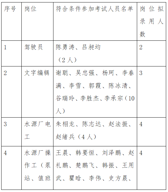 按照濮陽(yáng)市自來(lái)水有限公司網(wǎng)站公示的崗位招聘條件,對(duì)應(yīng)聘人員進(jìn)行了嚴(yán)格篩選,現(xiàn)將符合條件參加考試人員名單公示如下: