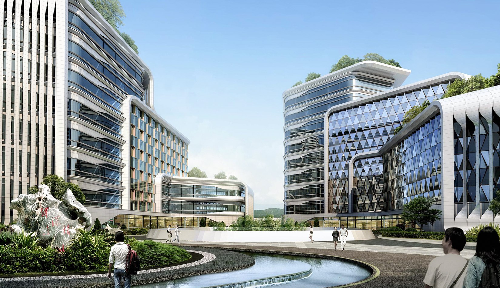 整個(gè)園區(qū)內(nèi),散落著五個(gè)獨(dú)特的建筑單體,分別以不同的顏色代表五大洲建筑形象,與五環(huán)顏色相匹配。象征著院士們來(lái)自于五湖四海,匯聚在院士港這個(gè)港灣。