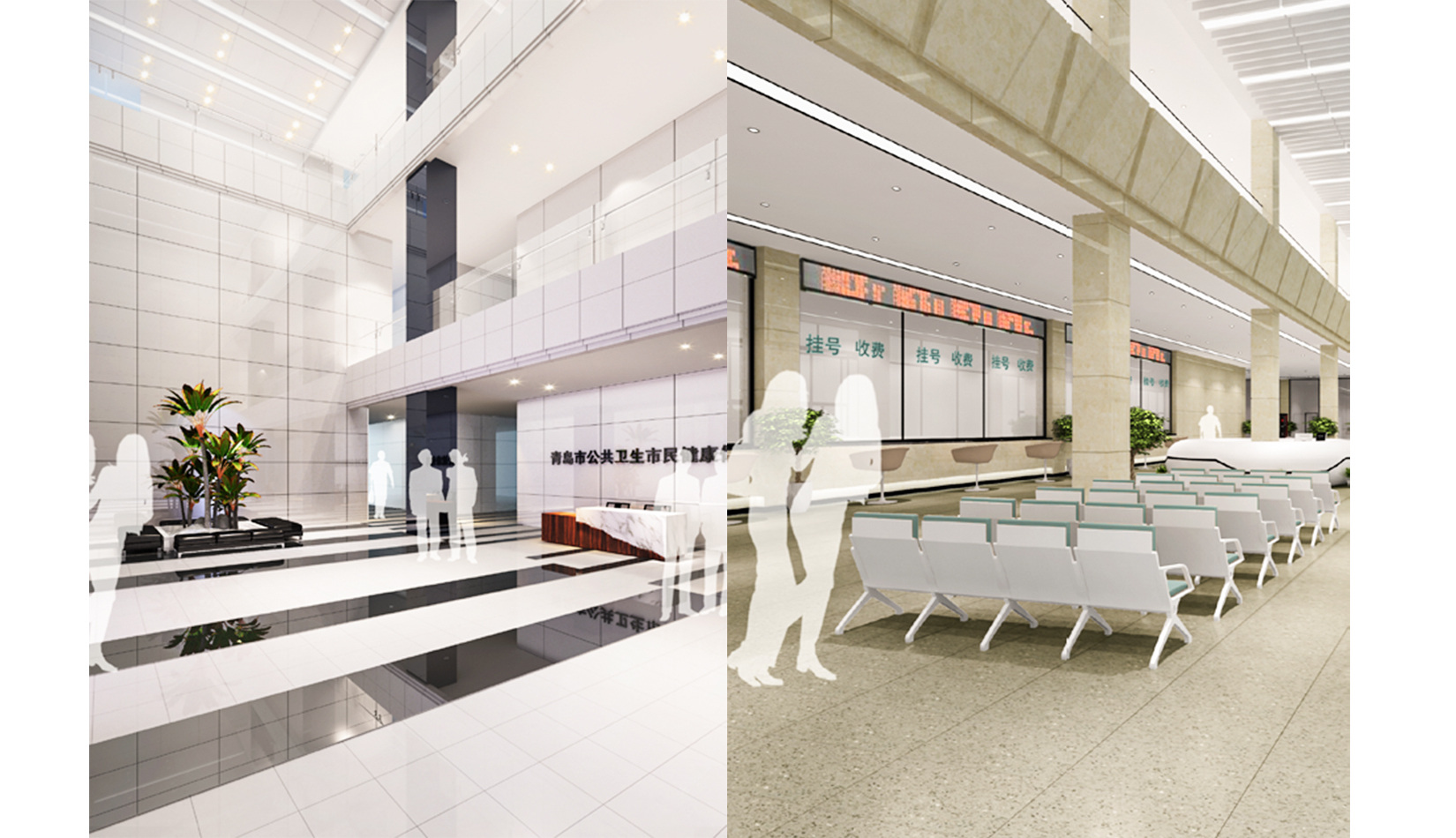 結(jié)合周邊的環(huán)境和節(jié)省造價的因素綜合考慮,建筑立面為干凈簡潔的現(xiàn)代風(fēng)格,臨床中心以橫向線條為主,公共衛(wèi)生中心以豎線條為主,市民健康體驗中心強調(diào)建筑的標(biāo)志性;建筑平面主要解決不同功能的區(qū)域劃分和避免流線交叉的問題。