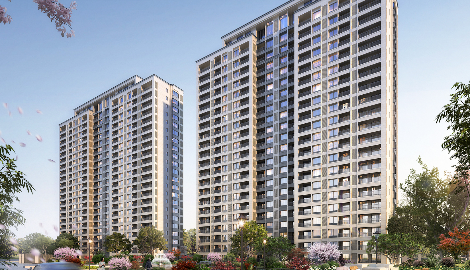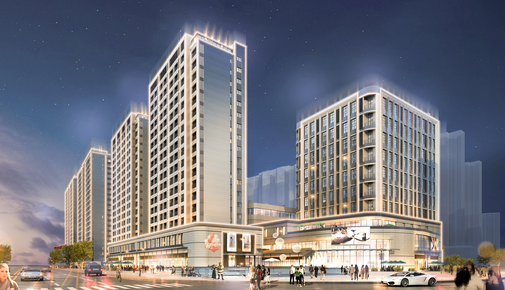 立面打造可識別性的“社區(qū)”建筑語匯,在周邊版塊中做到脫穎而出。建筑風(fēng)格莊重精美,通過運用傳統(tǒng)美學(xué)法則來使現(xiàn)代的材料與結(jié)構(gòu)產(chǎn)生規(guī)整、端莊、典雅的安定感。商業(yè)立面通過將具有力量感的矩形石材墻面和玻璃幕墻進行體塊穿插與虛實結(jié)合。勾勒出與住宅風(fēng)格一致的現(xiàn)代,簡約,富有商業(yè)氣息的造型。同時,創(chuàng)造出豐富的露臺空間與立面層次,完美的樹立了本項目的沿街形象。