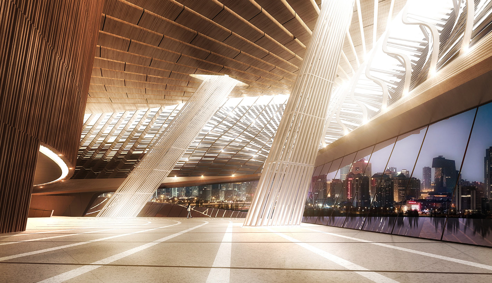 觀眾廳整體空間形態(tài)采用馬蹄形設(shè)計,觀眾廳建聲采用聲學(xué)墻與裝飾墻結(jié)合的方式。延建筑東南部呈“U”型環(huán)繞觀眾廳布置,觀眾二層、三層休息廳設(shè)置吹拔,結(jié)合兩側(cè)連續(xù)坡道,構(gòu)成游走空間,將各層休息廳在空間上相互連通,并結(jié)合建筑表皮,形成莊重、典雅又不失生動的空間體驗。