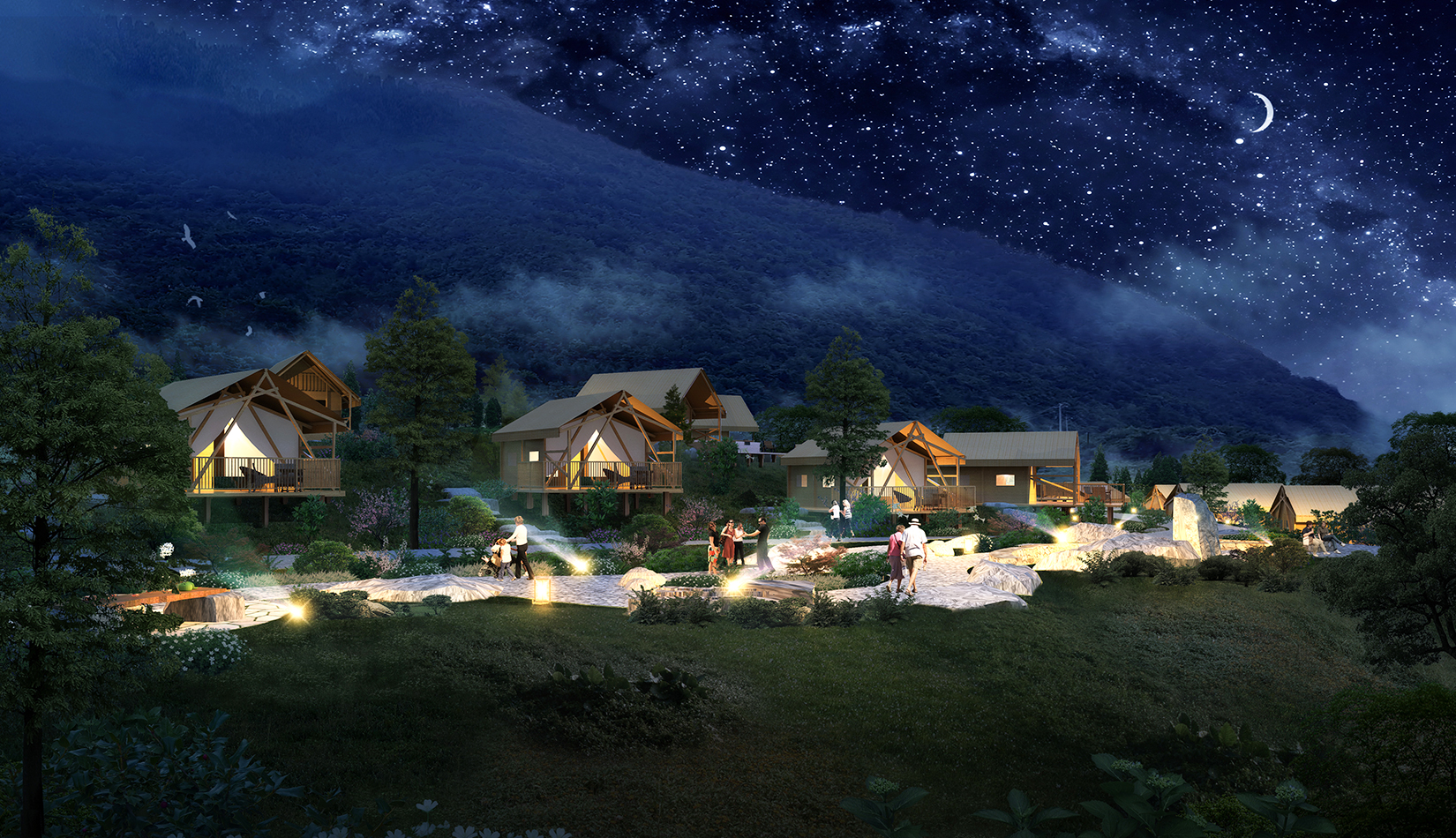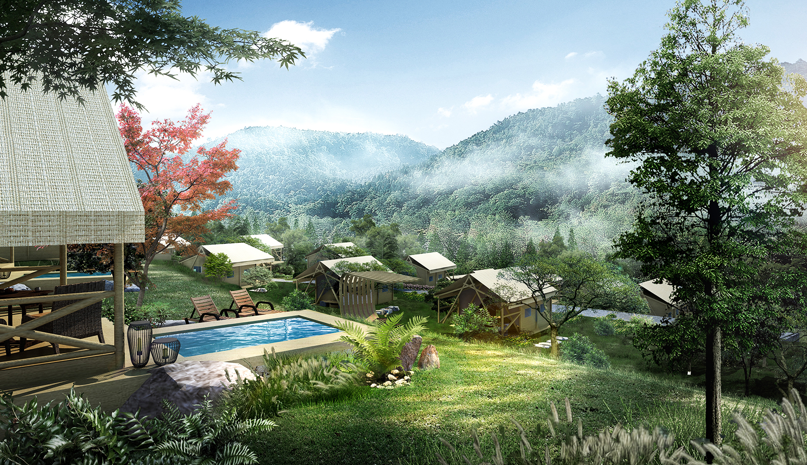 根據基地的地勢分布及功能需求,空間結構上分為“一帶兩軸三核心五組團”。建筑設計的五個組團,分別是濱水休閑組團、水畔風光帳篷組團、高端養(yǎng)心帳篷組團、中心服務組團及山居野趣帳篷組團??头坎糠植捎脦づ穸燃傥莸姆绞剑癸@野奢度假的浪漫形式。