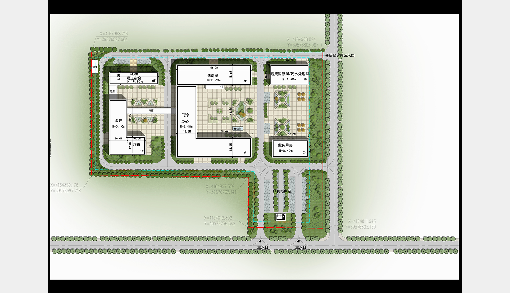 景觀設計采用圍合、穿插、滲透等設計手法,營造公園式景觀綠化,與建筑群體融合呼應,打造一個會呼吸多元化的綠色醫(yī)院,利用建筑之間的圍合關系,創(chuàng)造動態(tài)的具有生命力的局部景觀。