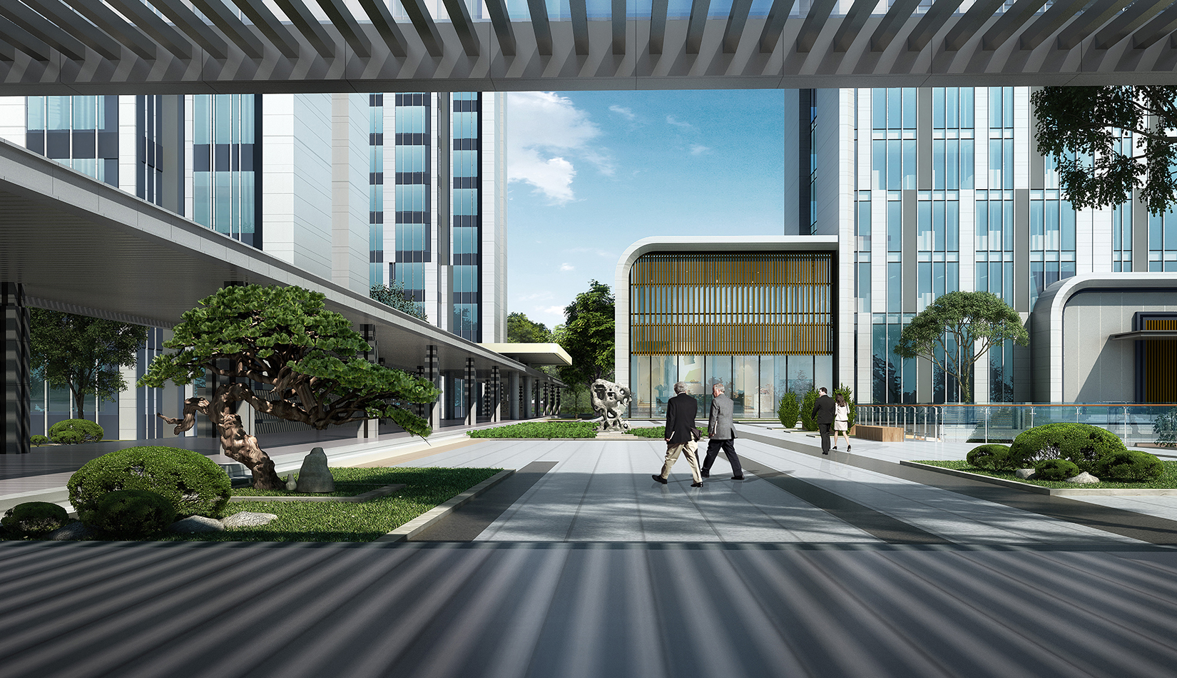 建筑圍合共享的中間庭院,庭院采用新中式風(fēng)格,屋頂設(shè)計(jì)屋頂花園,靜謐淡雅,為人們提供一個(gè)安靜休憩空間。
