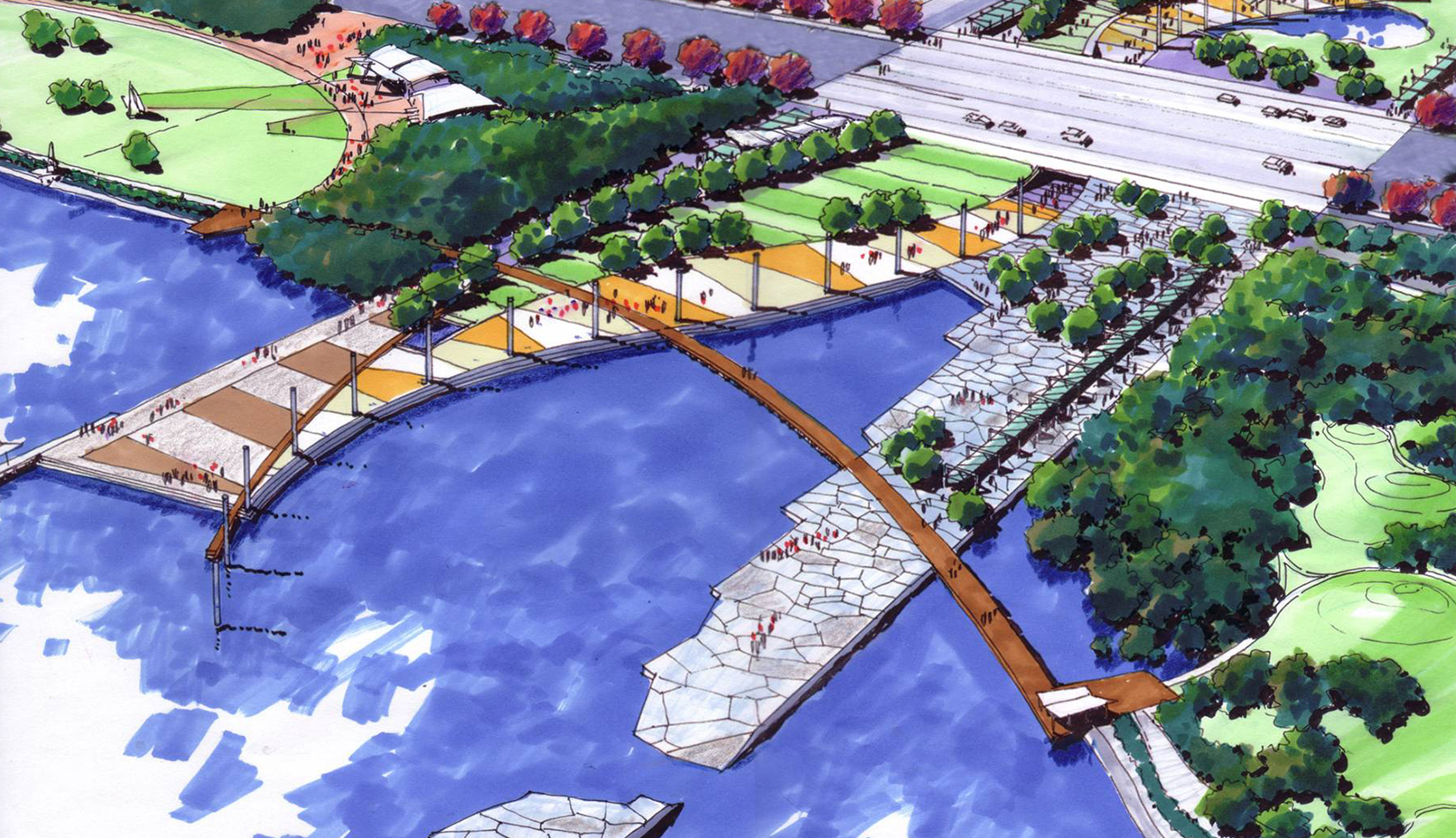 本著“文化著陸于自然”、“邊界突出聯(lián)系”的設(shè)計(jì)理念,規(guī)劃將灣島全線自西向東分為濱海運(yùn)動(dòng)休閑、親水廣場(chǎng)、公共藝術(shù)公園、人與自然公園和碼頭休閑娛樂5 個(gè)景區(qū),為基地北側(cè)的城市功能區(qū)乃至黃島區(qū)提供了一片高品質(zhì)的、現(xiàn)代濱海城市休閑景觀帶,增強(qiáng)區(qū)域的軟環(huán)境競(jìng)實(shí)力。