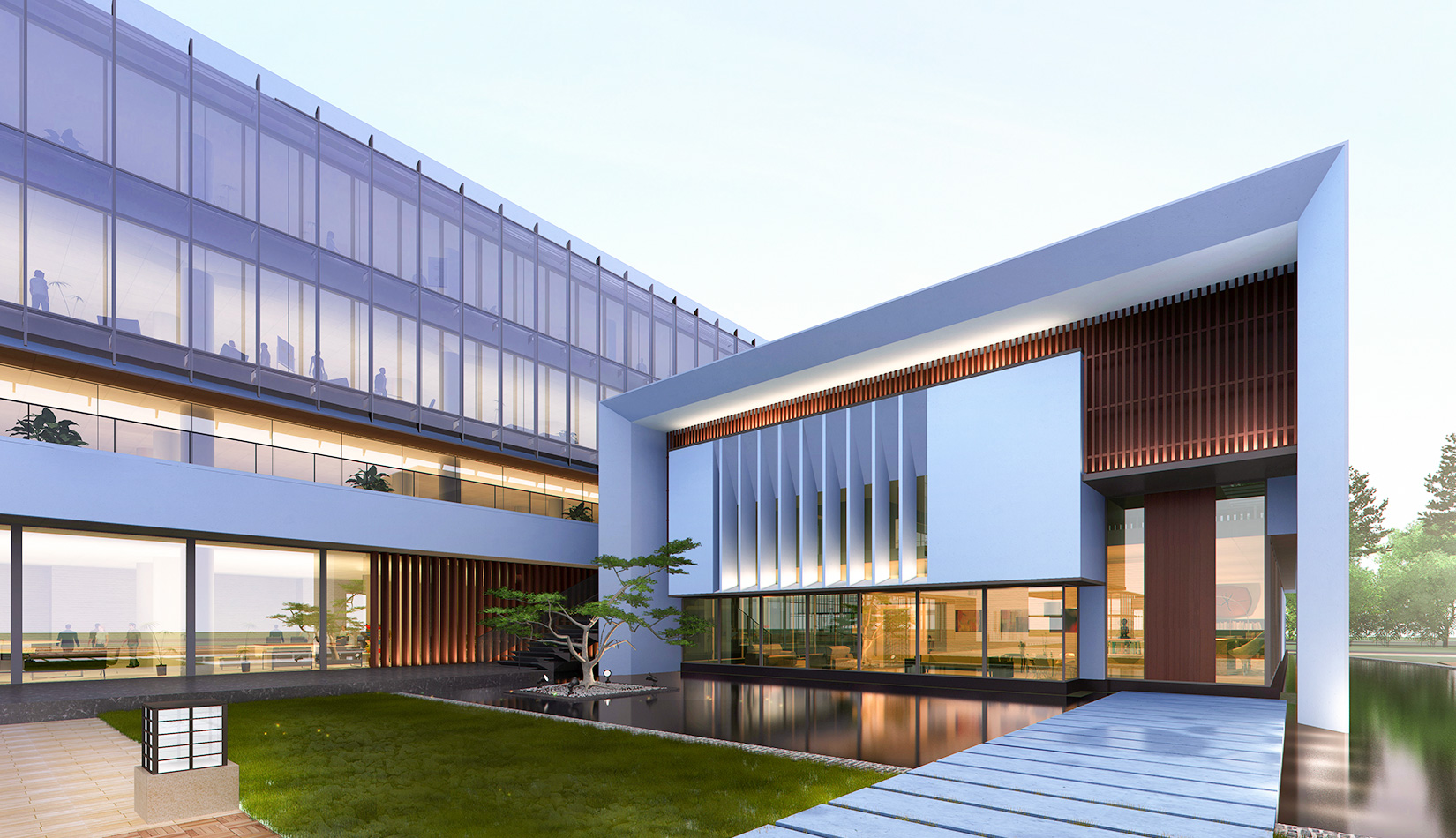作為中韓貿(mào)易合作區(qū)一期啟動區(qū)的重點(diǎn)項(xiàng)目,其承擔(dān)著對外展示以及為后續(xù)發(fā)展提供服務(wù)平臺的功能。因此設(shè)計力求穩(wěn)重大氣,以4 層的體量打造出地標(biāo)性的建筑。設(shè)計運(yùn)用簡潔的外形、寧靜的色彩,外立面以白色涂料和木格柵為主,尊重自然,打造一種平和寧靜的感覺。在空間設(shè)計上通過共享空間、上人露臺和一層大平臺,創(chuàng)造出舒適宜人的工作環(huán)境;在技術(shù)上通過地源熱泵、呼吸式幕墻、雨水收集等的應(yīng)用,實(shí)現(xiàn)建筑的綠色節(jié)能環(huán)保。