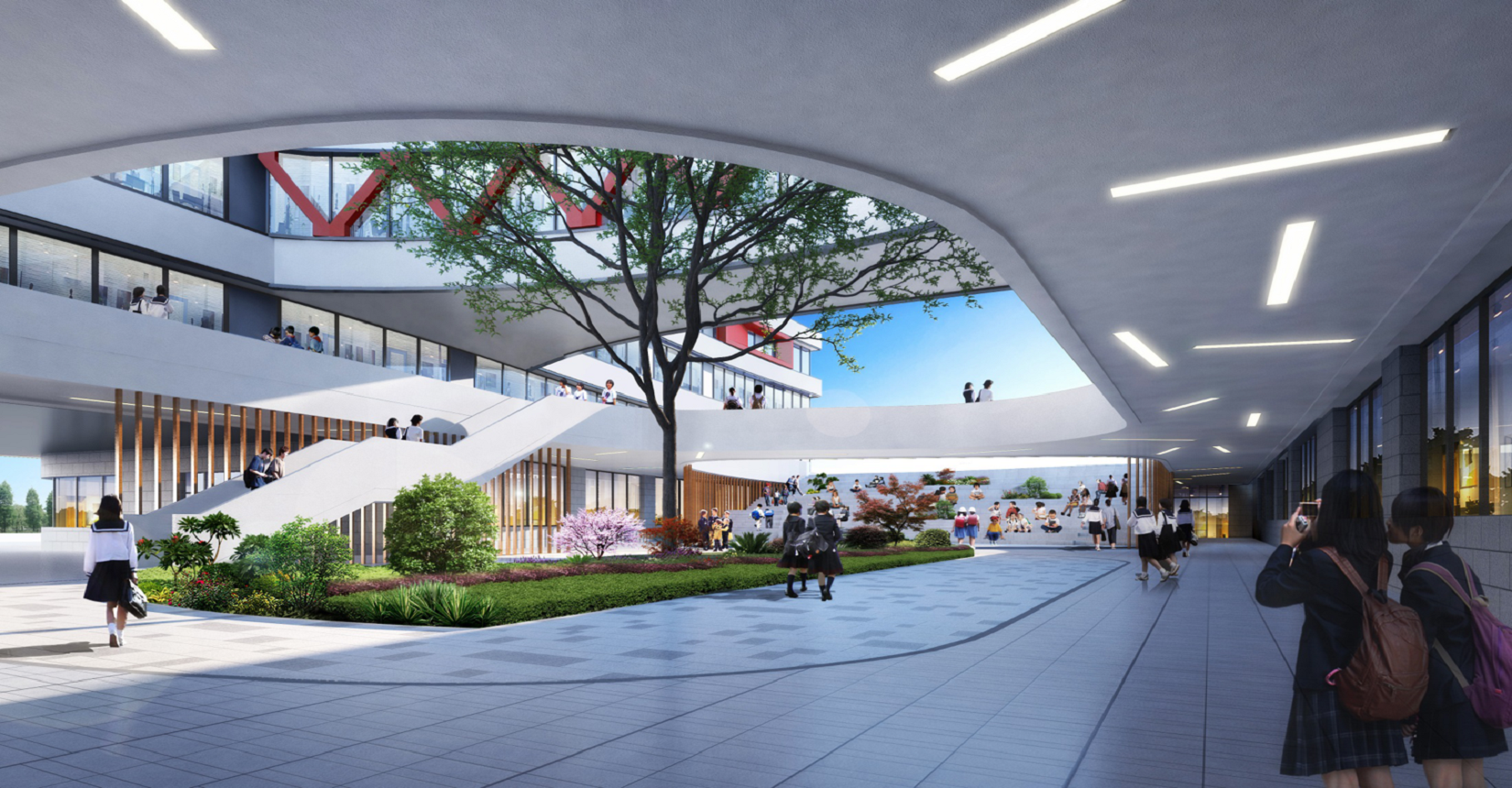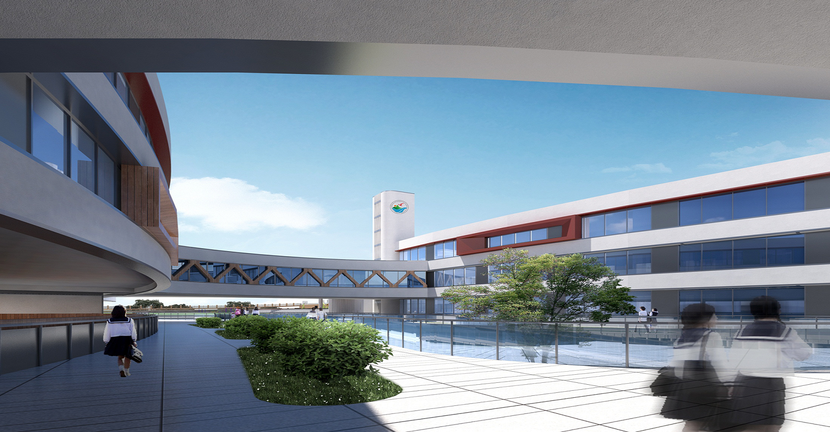 校園規(guī)劃采用曲線手法,營造流水姿態(tài),將東側(cè)山脈與西側(cè)河流連接在一起。設(shè)計現(xiàn)代化“山水”校園,使學(xué)生在自然中成長。營造活水發(fā)源的“源頭”意境,寓意教育為人類文化長河的源頭,呼應(yīng)學(xué)?!霸搭^”文化。曲線舒展的形體,整體采用白色色調(diào),局部以紅黃色進行點綴,風(fēng)格純潔又不失活潑。